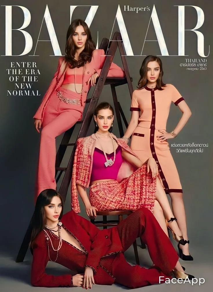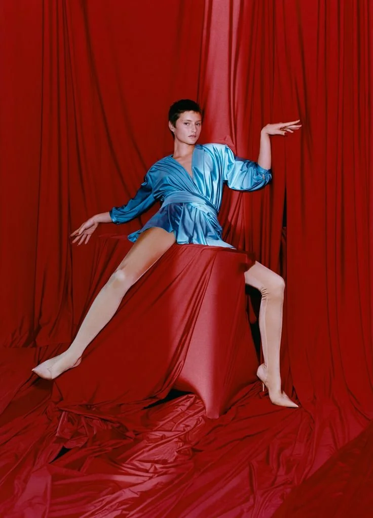 n a high-end studio with a glamorous burgundy red backdrop, the scene exudes luxury and sophistication. A poised, sharply dressed man, visionary founder of a high-fashion brand stands confidently, embodying style and ambition. Around him, three stunning women radiate elegance, each wearing impeccably designed dresses that flow with luxurious fabrics, their poses bold and magnetic. High-end lighting highlights every refined detail, casting a rich glow on the couture pieces and the charisma of each model. This is a world of posh fashion, where every element whispers exclusivity and timeless style, capturing the allure of high fashion at its finest.